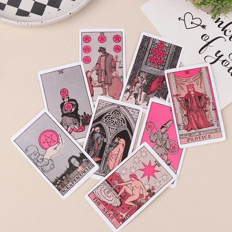 ?Companheiro espiritual?Mergulhe nas energias calmantes do nosso baralho de tarô com tema rosa, criado para aprimorar sua jornada espiritual e aprofundar sua conexão com o divino. Se você é um iniciante explorando o mundo do tarô pela primeira vez ou um praticante experiente buscando novos insights, nosso deck serve como um companheiro confiável, guiando-o para uma maior autoconsciência, clareza, e iluminação.